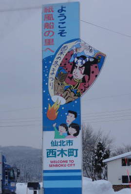 震災から3年後の2月10日に、念願の西木村での紙風船祭りに参加させてもらって、お礼を申し上げることができたのでした。 (左と上の計4枚はその際のもようです) |