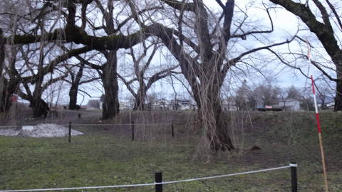 | 車で出発地まで行くので、朝早い列車だと前泊が必要になります。角館は花見の時期にしか来たことがありませんでしたが、車中泊のできる郊外の駐車場は押さえてあります。でも花見シーズン以外には中心部に近い駐車場でも利用可能ではないかと思い、行ってみると、案の定お客さんはほとんどいなくて、道路向かいにきれいで暖かいトイレがあるところを利用することが出来ました。 桧内川沿いの桜並木はまだつぼみで、雪の塊も溶け残っています。 |