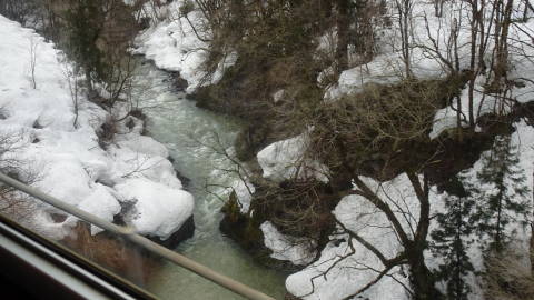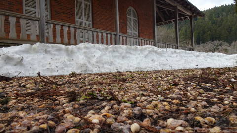 | 阿仁合駅の近くを、帰りの列車までの時間で巡ります。残念ながら駅売店以外の商業・見学施設まだ開いていません。阿仁町異人館は、鉱山の技術指導に来た外国人技師にかかる展示等があります。周囲はまだ雪がたくさん残っています。 雪の手前にあるのは銀杏の実です。だれも採らないみたいでもったいないですね。 |
