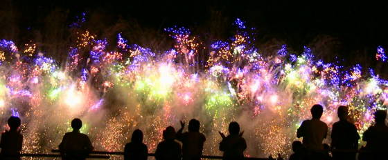 雨でも大会は実施されます。いつもどおりナイアガラ(?)から始まりますが、無料席からは残念ながら上の煙しか見えません。 集まった人はやはり雨で昨年より11万人ほど少ない65万人ほどだったようです。夕方に結構強く降りましたのであきらめて戻ってきた人も多いようで、開始前の大曲橋では戻る人の流れのほうが、向かう人よりもたくさんでした。 |
